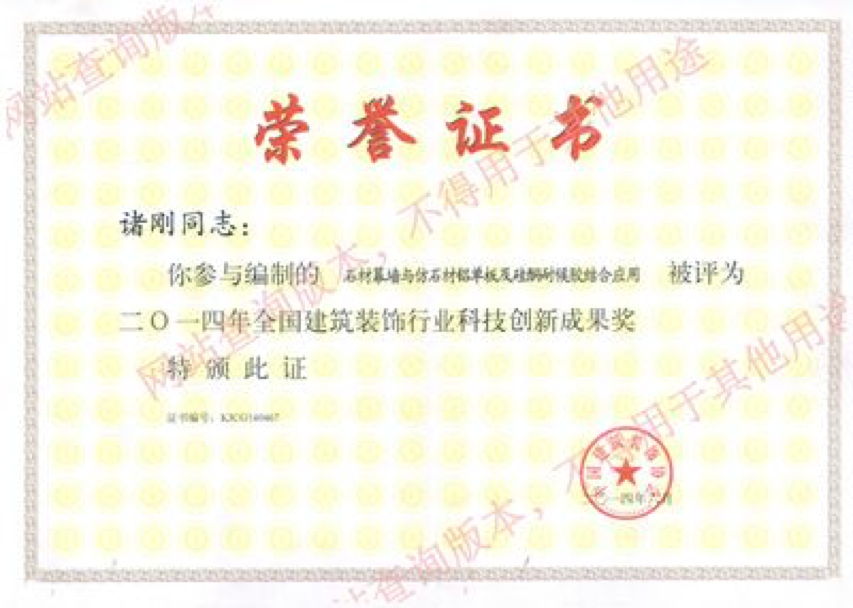 2014-10-25喜訊:熱烈祝賀我公司諸剛同志榮獲2014年全國建筑裝飾行業(yè)科技創(chuàng)新成果獎...