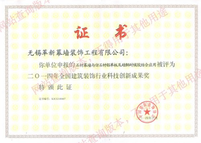 喜訊:熱烈祝賀我公司榮獲2014年江蘇省建筑行業(yè)科技創(chuàng)新成果獎(PDCA及全面控制方法綜合控制石材幕墻質量)